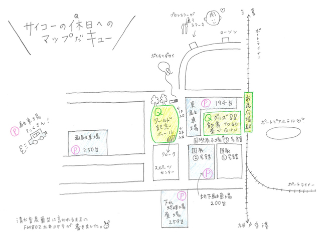 なお、神戸場所のフード情報、会場マップも公開された。フードは、ガーリックシュリンプ、ハンバーガー、鉄板ナポリタン、バジルチキンプレート、ガパオご飯、ミルフィーユカツサンドなど、バラエティに富んだメニュー。会場マップは、FM802土井コマキが清水音泉番台に言われるがままに書いたという手描きのものとなる。