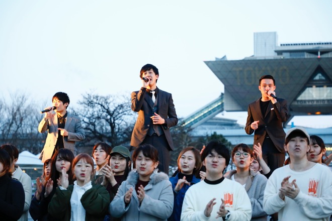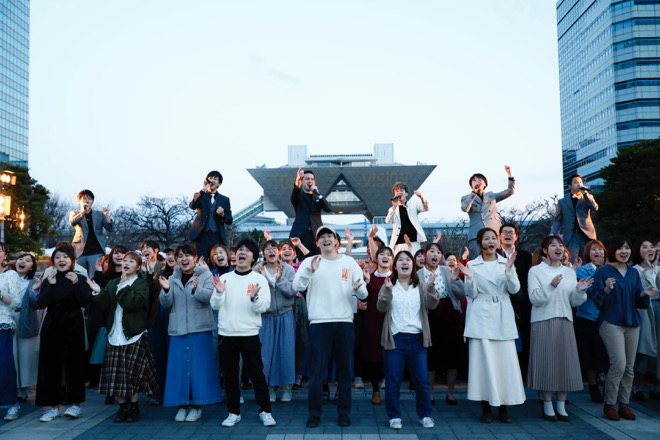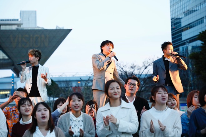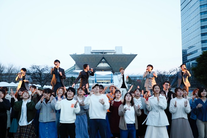 初日イベントは、大学合同アカペラサークルライブ<50Fes>に参加する学生たちのオープニングアクトで始まった。6名のメンバーがステージに登壇、アカペラで歌い始めたのは、坂本九の「明日があるさ」だ。その歌が進むにつれ、ステージ周辺の一般来場の中に紛れていたメンバーたちが自然発生的にパフォーマンスに合流するというフラッシュモブ展開で来場者を魅了。ラストは、ステージおよび周辺に集結したメンバーたちが大合唱を繰り広げた。