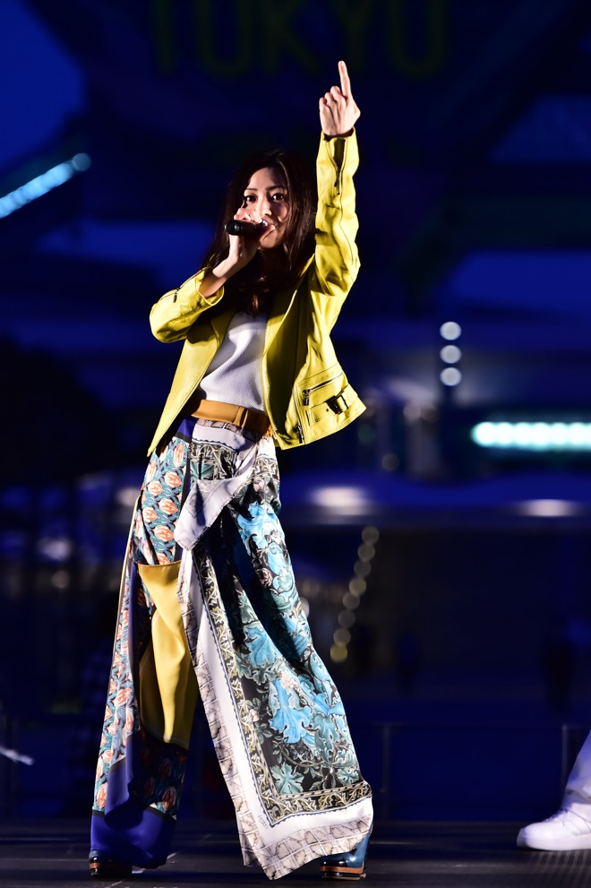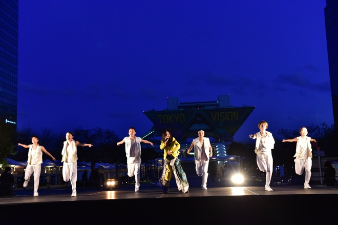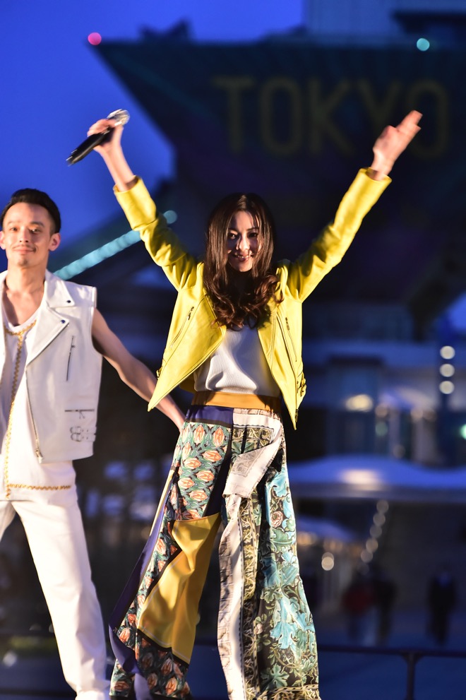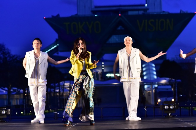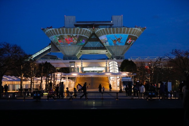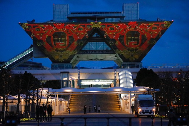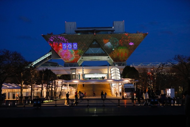 倉木のステージが終了する頃に、あたりが夜のとばりに包まれた。メインイベントとなる約8分間のプロジェクションマッピング『TOKYO VISION 〜500 Days to Go! Night〜』が投影される時刻だ。東京ビッグサイトのシンボルともいうべき逆三角形が左右に連なった会議棟の壁面に“10”という数字が表れ、会場が一体となって「3、2、1、スタート!」の掛け声を上げると投影が始まった。