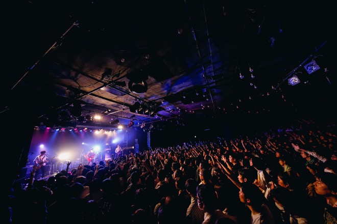 というMCから、イントロのギターフレーズとドラムの響きが印象的なアルバム表題曲「ホームタウン」を披露。サビではリズムに合わせ、手拍子が会場に鳴り響く。ライブは前半から「モータープール」「荒野を歩け」など最新楽曲群の中に、「ループ&ループ」といった人気曲も織り交ぜて展開されていく。アルバム制作を経て、よりパワフルに、そして重心の低くなった伊地知潔のドラムと山田貴洋のベースが作るリズムの上で、喜多建介のギターリフが鮮やか。