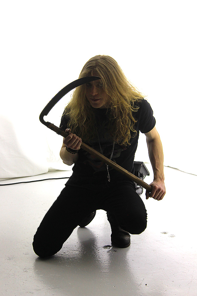 撮影の途中でスタジオの天井の端っこになぜか掲げられていた大きなカマに目がいったヴィッレ。それを使って撮影ずることに。カマの先の刃の部分がゆるくて、勢いつけて振り回したら先が飛びそうでやばい。ゆっくり気を付けながら動作するヴォーカルのアルデ。それでも近くで見てるとカマの先が飛んでこないかちょっとひやひや。