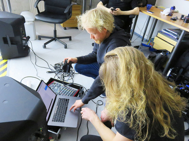 撮影時の曲は通常速度の他、遅くなったり早くなったり。曲をかけるヴィッレとアルデ。