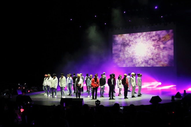 開演は16時。場内が暗転するとシンフォニックなSEが流れ、ステージ上のスクリーンに出演アーティスト8組が映し出された。その後、ステージ中央円形リフトがせり上がり、全出演者が姿を現すといったサプライズなオープニングに、ファンは大きな歓声を上げた。そして、この夜のMCを務めるApeaceのウォンシクとヨンウクの登場が会場に火を点ける。
