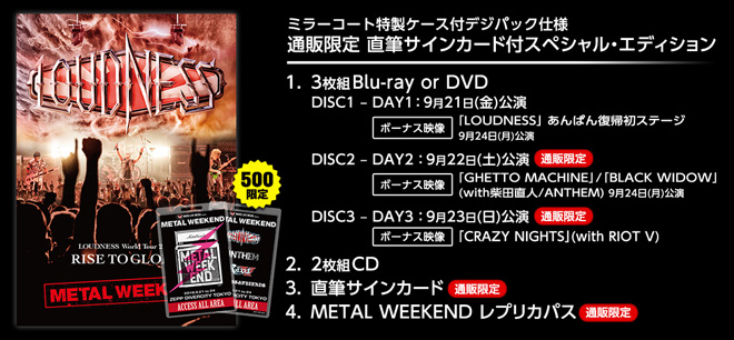 通販500セット限定スペシャル・エディションは、さらに貴重映像を満載したファン垂涎のマスト・アイテムだ。DAY1の映像/音源の他、DAY2、DAY3から厳選したライヴ映像を収めたボーナスBlu-ray(DVD)を追加した全5枚組で、各ボーナスディスクには、ANTHEM柴田直人をフィーチュアした「GHETTO MACHINE」「BLACK WIDOW」、RIOT Vと共演した「CRAZY NIGHTS」の映像が追加収録され、さらにMETAL WEEKENDレプリカパスと直筆サインカードも同梱された超豪華装丁となっている。
