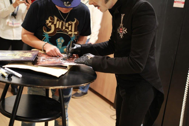<DOWNLOAD JAPAN 2019>翌日の3月22日(金)には、タワーレコード渋谷店で自身初となる日本でのサイン会&撮影会を行った。サイン会参加券は発表すぐに上限枚数に達し、集まったファンはゴーストのTシャツ着用はもちろんのこと、顔にペイントをしたり、バンドメンバーのネームレス・グールズの仮面を被った5歳の男の子も参加し、コピア枢機卿は全員に対して紳士的にサインと握手や撮影などを行った。その後、コピア枢機卿は渋谷交差点に現れると写真撮影し、今回の来日最終日の夜を締めくくった。