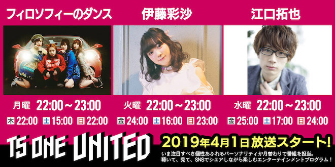『TS ONE UNITED』は、注目のアーティストたちが月替わりでパーソナリティを務める60分のエンターテインメントプログラム。4月は、月曜日の放送をフィロソフィーのダンス、火曜日の放送を伊藤彩沙、水曜日の放送を江口拓也が担当する。視聴アプリ「TS PLAY by i-dio」上ではワンタップ操作でSNS投稿も可能だ。聴いて、見て、SNSでシェアしながら番組を楽しもう。