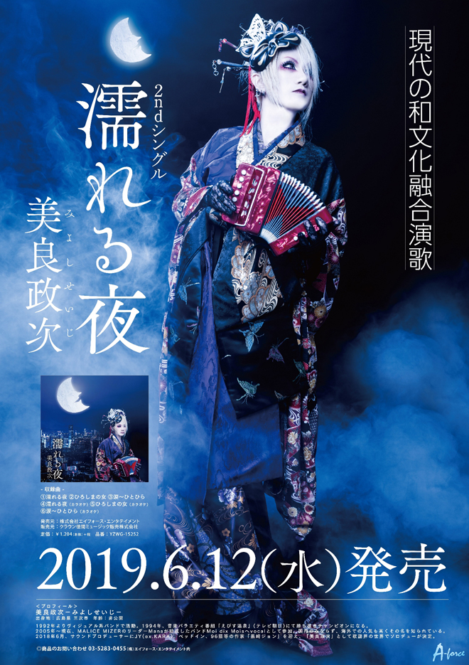 昨年「未練橋」でヴィジュアル系演歌歌手としてデビューした、Moi dix Mois(モワディスモワ) Vo.Sethこと美良政次が、2ndシングル「濡れる夜」を6月12日(水)にリリースする。