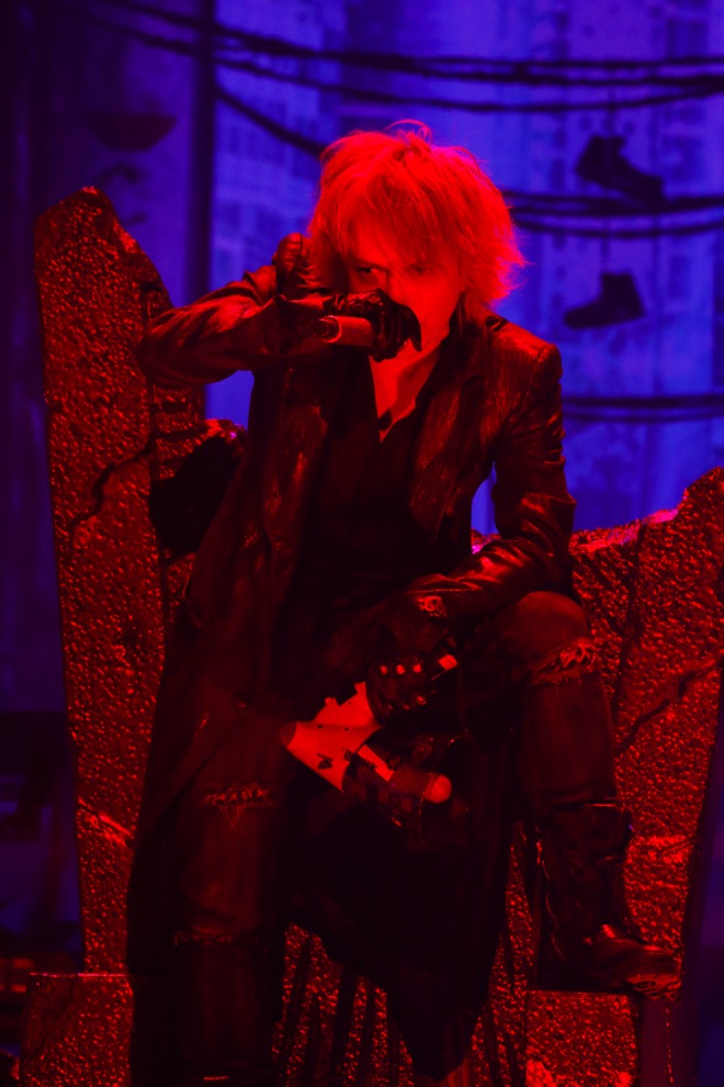 ライヴ中盤は、ステージ初披露となる楽曲とライヴハウス規模を超える演出が、この夜のハイライトシーンのひとつとなった。瞬間的に暗転したステージが真っ赤なライトに照らされると、そこには岩盤から削り出されたかのようなキングチェアからフロアを見下ろすHYDEの姿が。狂おしいほどに美しい旋律と歌声が重低音を貫く「SET IN STONE」「DON’T HOLD BACK」は、ときにイスに深く腰を掛け、ときに激しいヘドバンを繰り返し、ときに座面に立ち上がって圧倒的なカリスマ性を放つなど、楽曲同様、自在に姿を変えながら表情豊かに旋律の感情をなぞっていく。「Next Song is New Song!」とコールされた「SICK」は本邦初公開のナンバーだ。凶暴に突進するツービートとサビに配されたキャッチーなメロディのコンビネーションが1曲のなかに緩急を生み出していくジェットコースターのような最速チューンだった。