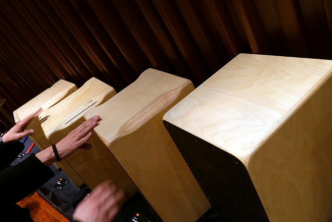 「カホンという楽器はミュージシャンにとってとても便利な楽器だと思っています」というホセさん。「スペインでは、ほとんどのドラマー、パーカッションニストがカホンを使っています。小さいライブやアコースティックライブで使われます。スペインのカホンとペルーのカホンの違いですが、スペインのカホンは中に響き線が入っています。なので、基本的な3種類の音がきれいに出ます。たとえば、ドラムの音のように低音、中音、高音とすべてカホン1つできれいに出ます」と、まずはスペインのカホンの特徴を説明。続いてLa Rosa Percussionのカホンについてコメント。