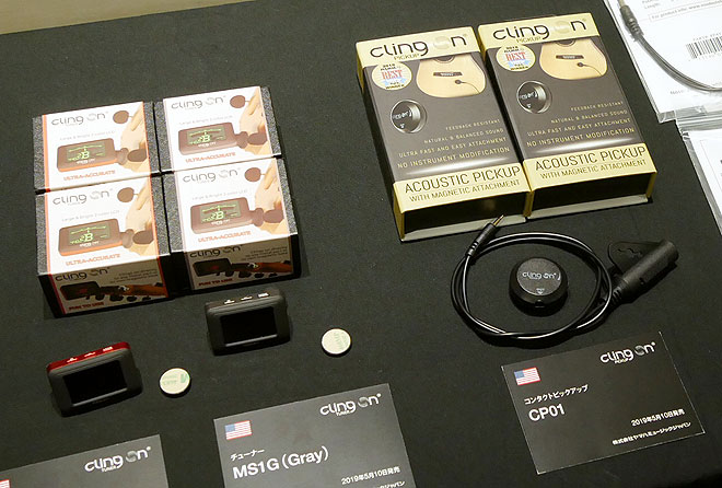 ▲チューナー「MS1R」「MS1G」とコンタクトピックアップ「CP01」。チューナーはRedとGrayの2色をラインナップ。