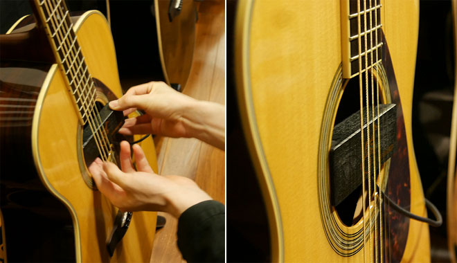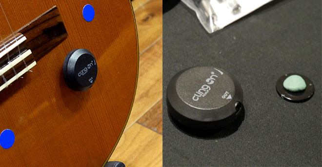 ▲写真左はピックアップをギターのトップに取り付けた状態(ケーブルは外してある)。裏側にマグネットベースが取り付けてあるが、デモ機ではその位置がわかるように目印のシールが貼られていた。写真右はピックアップ本体とトップ裏に貼り付けるマグネットベース。付属の練り消しゴムのようなもので板に貼り付ける。貼り付けの際はサウンドホールに手に入れる必要があるため、弦は外さなくてはならない。