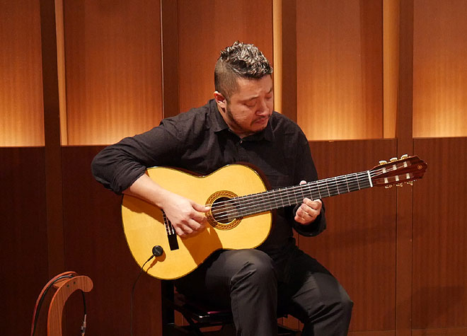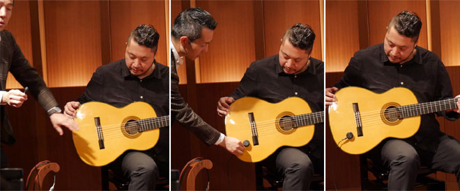ピックアップのサウンドを確かめてもらうべく登場したのは、ギタリストのマルセロ木村さん。マグネットベースを仕込んだギターに、ステージ上でピックアップを取り付け、すぐさま演奏をスタート。クラシックギターの繊細な音色を響かせた。感想を聴かれると「すごくいいですね。穴を開けなくてもいいし、音もソフトです。ナチュラルな音です。いい感じ」と笑顔で答えた。