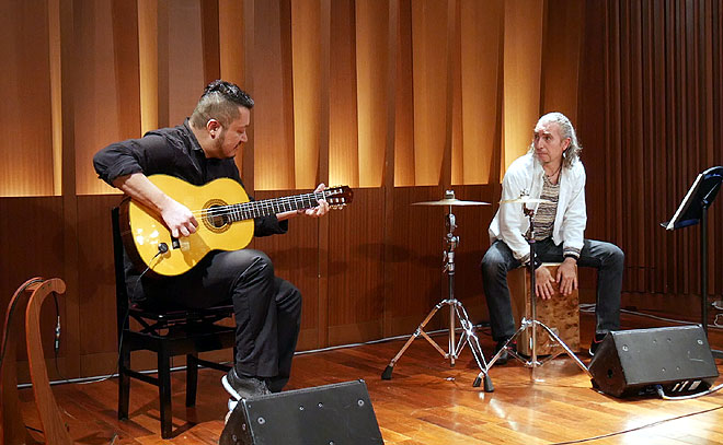 ▲発表会ラストはホセ・コロンさんとマルセロ木村さんによる迫力のパフォーマンス。息の合った熱い演奏で会場を大いにわかせた。プレイ前のセッティング時には、マルセロ木村さんが「ギタリストの人生の半分ぐらいはチューニングしてる、残りの人生はチューニングできてない状態で演奏する」と笑わせる場面も。