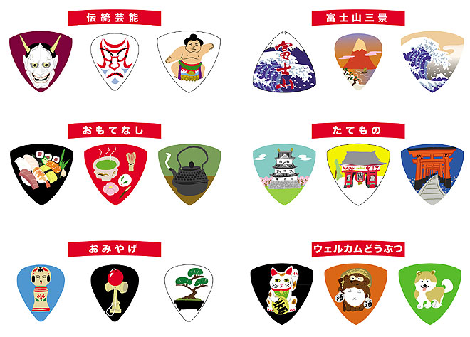 第一弾として、「伝統芸能」「富士山三景」「おもてなし」「たてもの」「おみやげ」「ウエルカムどうぶつ」の伝統的な絵柄をPICKBOYのピックにデザインした。もちろん裏面には「PICKBOY」のロゴ入り。デザイン性だけではなくピックとしてのポテンシャルも間違いないので、安心して使用できる。