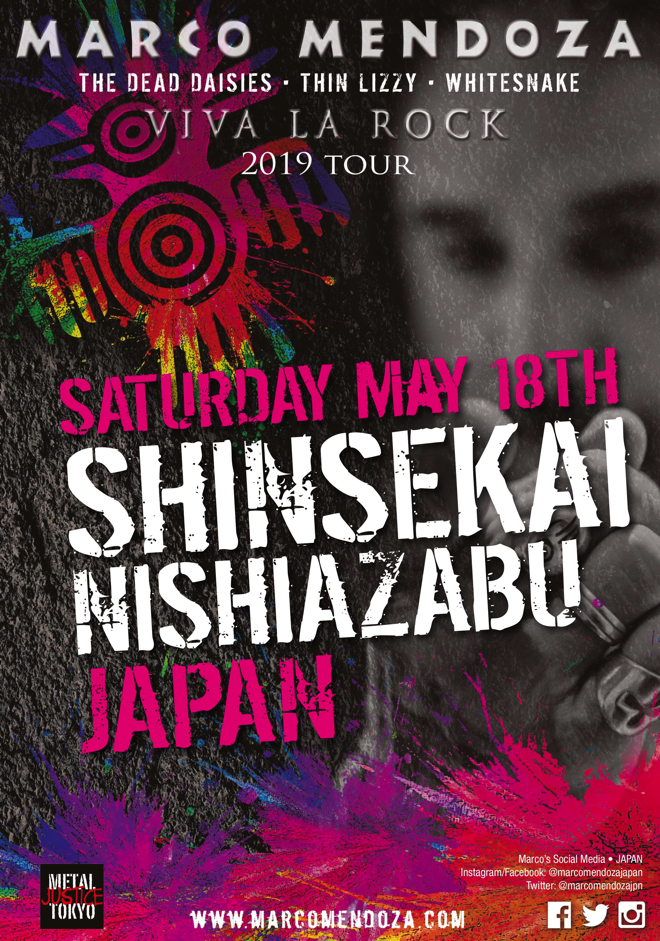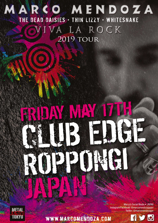 <Marco Mendoza “VIVA LA ROCK” PREMIUM GIG IN TOKYO JAPAN 2019>は5月17日(金)に六本木・CLUB EDGE、18日(土)に西麻布・新世界にて開催。METAL JUSTICE TOKYOでは、整理券番号付き特製ラミネートチケットや限定プレミアムグッズ、ミート&グリートアフターパーティーなどの特典が付いたVIPチケットが発売される。