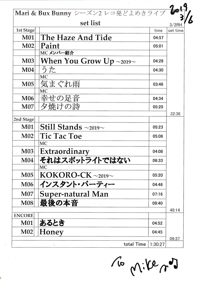 終演後のサイン会には真っ先に参加させていただいた。今回のLIVEで観た彼らとその力作『Mari & Bux Bunny シーズン2』は素晴らしいという言葉だけでは語れない。往年のファンだけではなく若いリアルなロック・ファンにも聴いて貰って、LIVEへ足を運んで欲しいと切に思う。