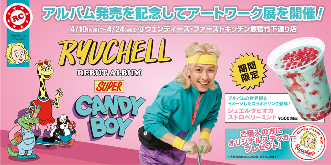 RYUCHELLが4月10日〜24日にかけて、東京・ウェンディーズ・ファーストキッチン原宿竹下通り店にて<RYUCHELLデビューアルバム“SUPER CANDY BOY”発売記念アートワーク展>を開催する。