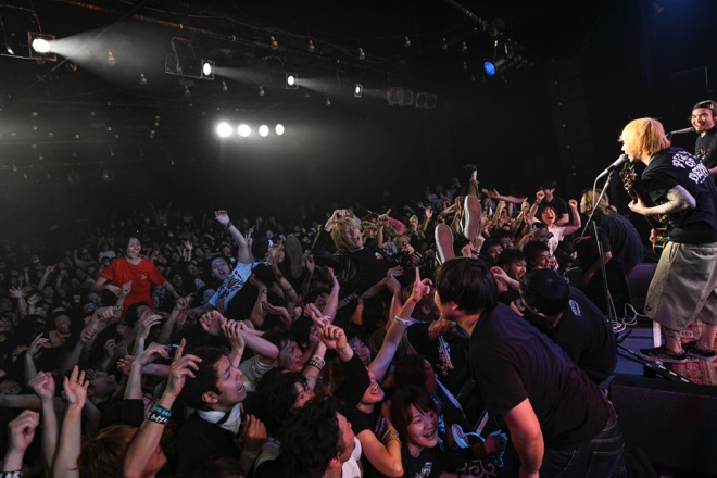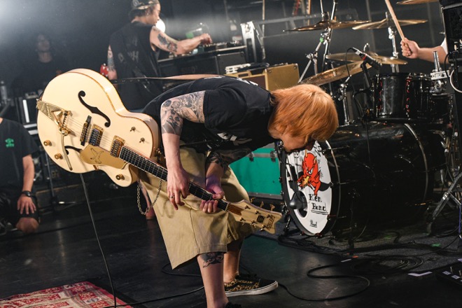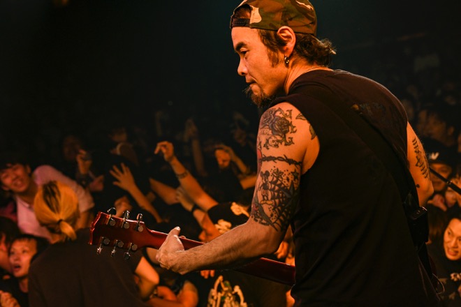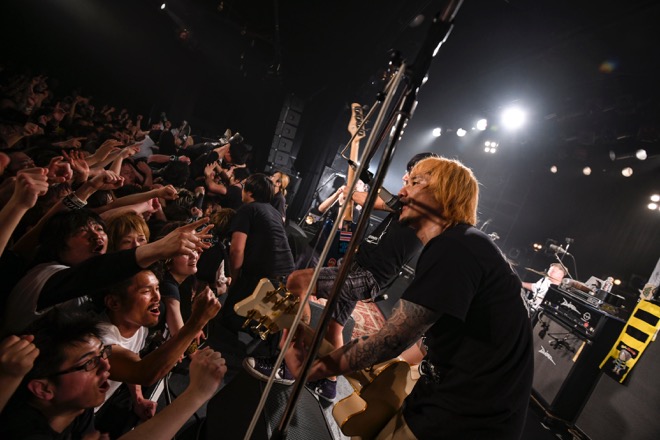 そう言うと、ベースのJun Grayと向き合って、静かにコードを鳴らし始めた。曲は春という季節にもふさわしい「Cherry Blossoms」。静かなイントロ直後、横山健はしっかりと松本英二を見た。それと同時に炸裂し始めたバンドサウンド。新たなKen Bandを祝福するように、フロアではクラウドサーフが次々に起こり始めた。オーディエンスのエネルギーを思いっきり浴び、自然に笑顔がこぼれる横山健、南英紀、Jun Gray、そして松本英二。勢いを加速させながら次から次へと曲を叩きつけていく4人だ。