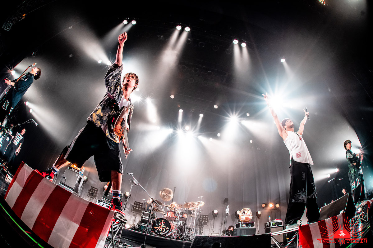 メンバー5人が楽器を携えて円陣を組み、スタートしたのは「日出ズル場所」。「やってきましたよBLITZ!」という赤飯の快声にオーディエンスがすかさず大きな歓声で応える様子からは、全員でライブを楽しく作っていくというオメでたファンの士気の高さが一発で伝わってきた。フロアを突き上げるようなパフォーマンスで拳をあげ、続けてはちょうど一年前にも歌った「鯛獲る」、そしてオーディエンスを4ブロックに分け、“ネタ”と“シャリ”とでぶつけ合う「wosushi〜ウォールオブ寿司〜」と、序盤から熱気が上昇気流になってのぼっていく。
