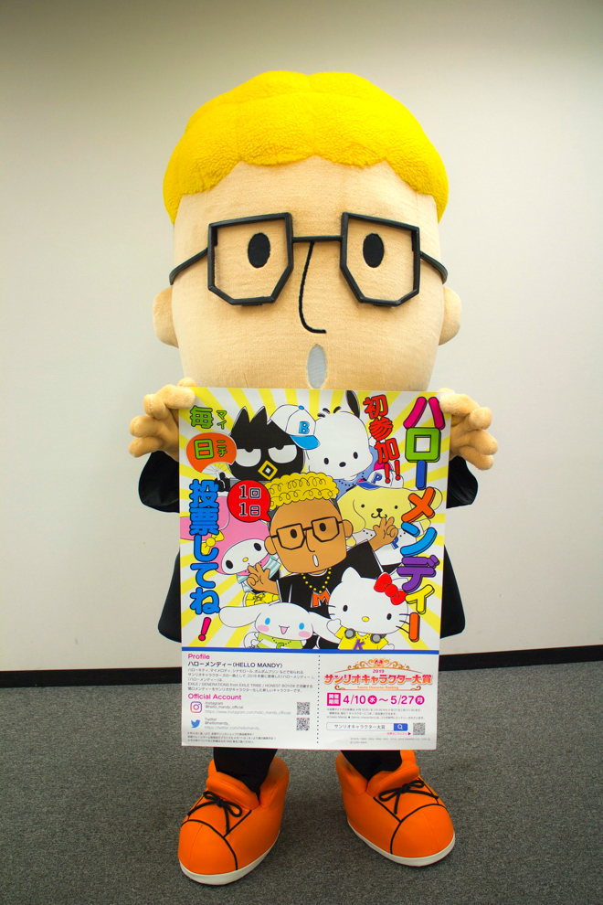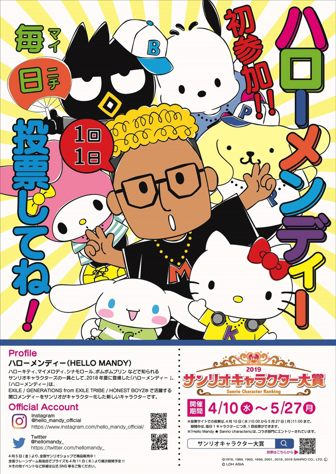 EXILE/GENERATIONS from EXILE TRIBEの関口メンディ―をサンリオがキャラクター化した「ハローメンディー(HELLO MANDY ★ SANRIO CHARACTERS)」が、『2019年サンリオキャラクター大賞 2019コラボ部門』への参加を表明した。
