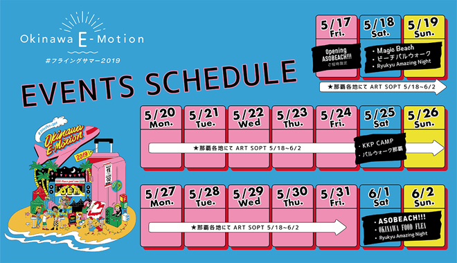 本イベントが開催される<Okinawa E-motion>では、マジック&フードフェスを融合した<マジックビーチ&ビーチバルウォーク>(5月18日、19日)、きゃりーぱみゅぱみゅ主催の対バンイベント<KPP CAMP>(5月25日)、那覇市飲食店のハシゴイベント<バルウォーク那覇>(5月25日)などを開催。ファイナルを飾る<ASOBEACH!!!>が行われる6月1日(土)・2日(日)は、人気フードフェス<OKINAWA FOOD FLEA>が同時開催される。