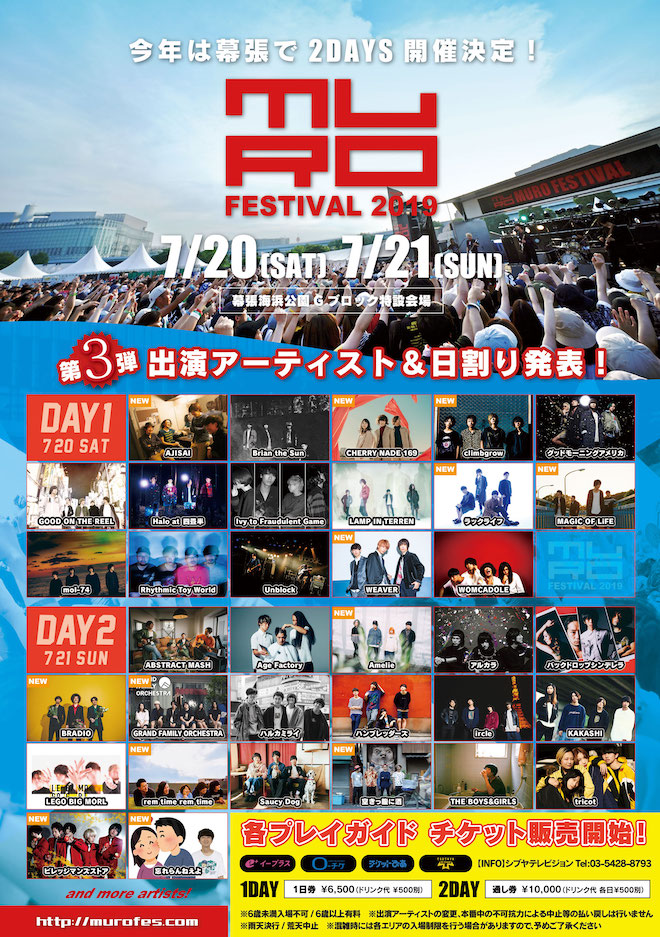 東京・お台場から会場を移し、8度目の開催を迎える2019年の<ムロフェス>。今回の発表では、7月20日(土)にAJISAI、CHERRY NADE 169、climbgrow、ラックライフ、MAGIC OF LiFE、WEAVER、21日(日)にAmelie、BRADIO、GRAND FAMILY ORCHESTRA、rem time rem time、空きっ腹に酒、ビレッジマンズストア、忘れらんねえよの計13組の出演が明らかになった。