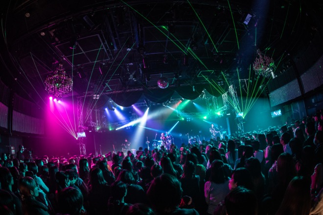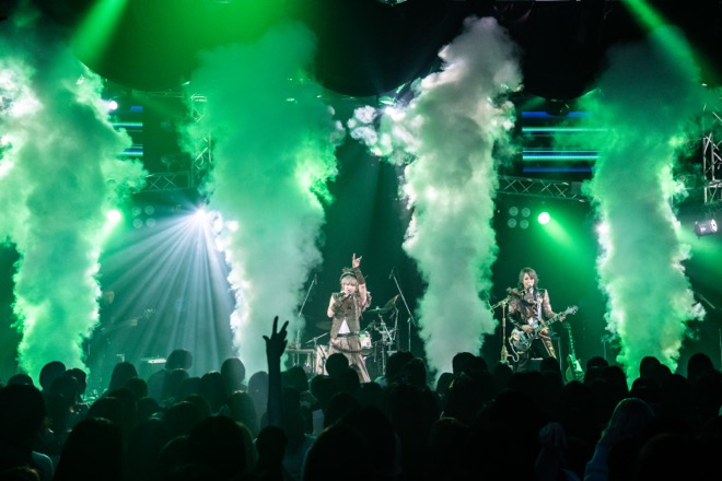 雰囲気は一転、場内はミラーボールが回るきらびやかなダンスフロアと化し、ダンサブルなロックチューン「PILL≠GRiMM」へ。エロティックな歌詞を艶っぽくも小気味よく歌うmichi.。それまで少し様子見していたファンも、その躍動感あふれるサウンドに身を任せて揺らす姿を見て、うれしそうにニコリと笑うKOJI。本能に根差した愛の欲望を描いた「capture -捕食者-」でさらに艶めかしい世界をみせた。