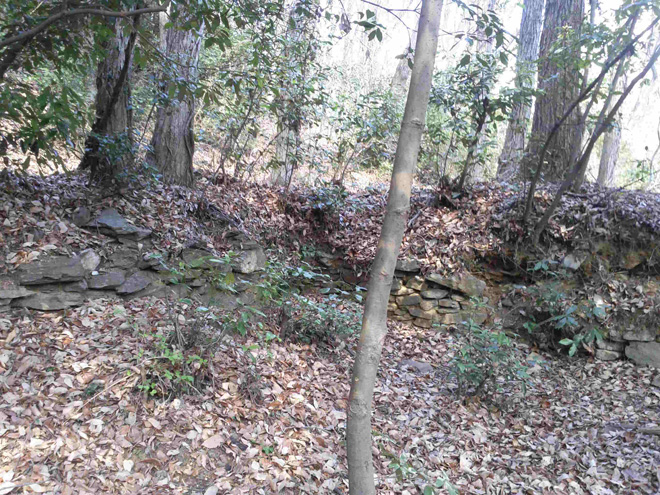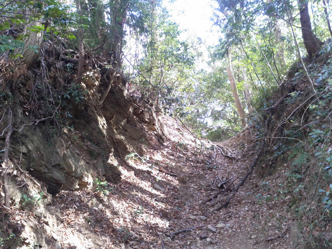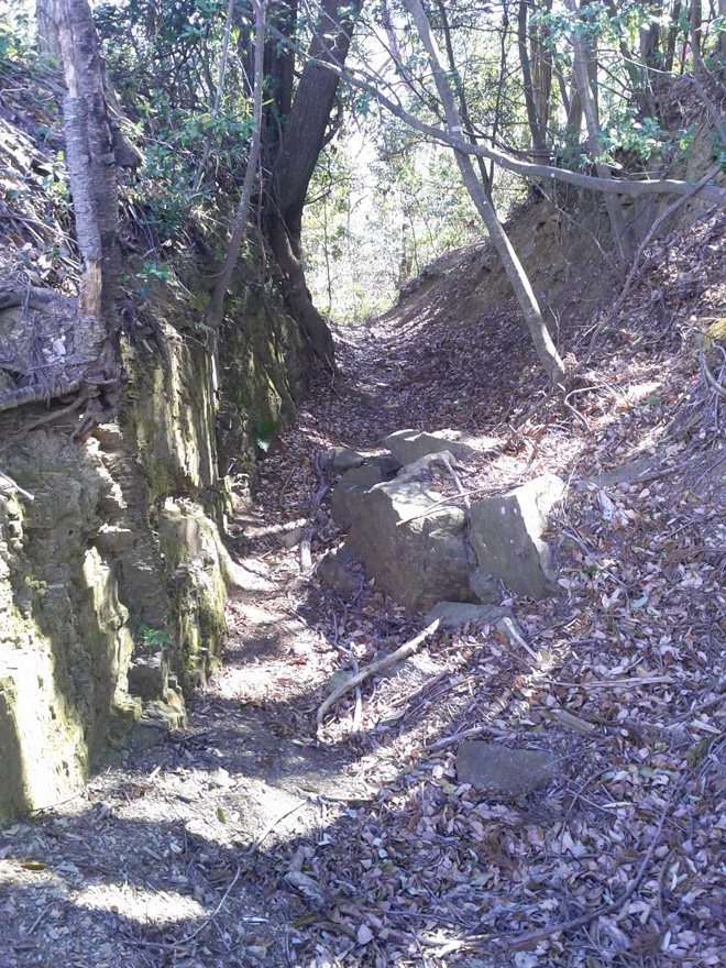 先にも書いた通り、大手がどこだか推測出来ない。見学し終わって自分なりに分析した結果ではあるが、城山を正面に見て、右から4つの竪堀が存在する。この一番右の一番長い竪堀を登らせて大手としたのではないか?と私は考える。というのもこの一番右の竪堀が一番太く、そして長く、真っ直ぐに伸びていて、途中に4郭と呼ばれている曲輪に登れる道があるのだ。他の竪堀にはそういった堀を跨いで曲輪に入れる道はないのである。もしくはこの4郭の更に外側から城に登らせて、合計4つの堀切を超えないと本郭に行けない仕組みにしていたか。話を戻すが、現在の道はその4つの竪堀の右から2本目の竪堀の付近を登るように繋がっている。途中にたくさんの曲輪がお目見えする、しかも石垣になっている。ここにまず感動。城内にはたくさんの岩があり、それを切っていた跡が残っている。全てが平べったい石なので牛蒡積みの石垣と言えるだろう。崩れかかっているが、いろんな場所に石垣が見て取れる。山城にこの石垣は凄い。