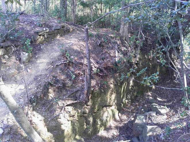 急斜面の道を登り切ると2郭と3郭の間の堀切、竪堀の下に到着する。高さも凄い。これを登るに当然ながら階段などない。なんとなく曲輪の端から登れるような道とも言えない道を上手く木に掴まって登ってほしい。そうするとわかるのだが、山自体は割と縦には奥行きがなく、横に広い城だということがわかる。登ってきた道を正面にして左側に移動していくといずれ本郭なわけだが、これまた藪をかき分けて進む。そうするとまたしても同じような堀切に遭遇、これでもかという堀切が何本もお目見えする。しかも岩盤を切って堀にしているところもある。当時はもっと深かったはずだが現在でも十分に深い。当然曲輪から曲輪に移動するにも橋などはないので(当時は絶対に橋が架かっていたと思う、じゃなきゃ城内を移動出来ない)また曲輪の端の部分からなんとか本郭へ登ってほしい。この曲輪の角にも石垣が見て取れる、崩れているが良よく見てみると相当な場所が石垣だったことがわかる、となると本郭は当時全部石垣が組まれていたのではないか?とイマジン出来る。