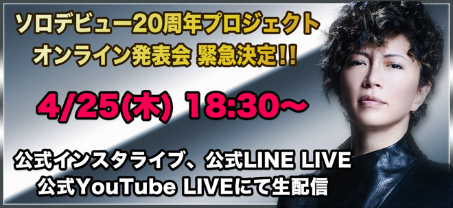 4月25日にソロデビュー20周年を迎えたGACKT。プロジェクトの詳細はInstagram LIVE、YouTube LIVE、LINE LIVEで行われた生配信で発表された。まず7月4日にパシフィコ横浜 大ホールで<46th Birthday Concert>、秋に<第95期 神威♂楽園 de トビナ祭>を開催。そして2019年にシングル、2020年にアルバムのリリースを予定し、現在制作を開始しているという発表も。