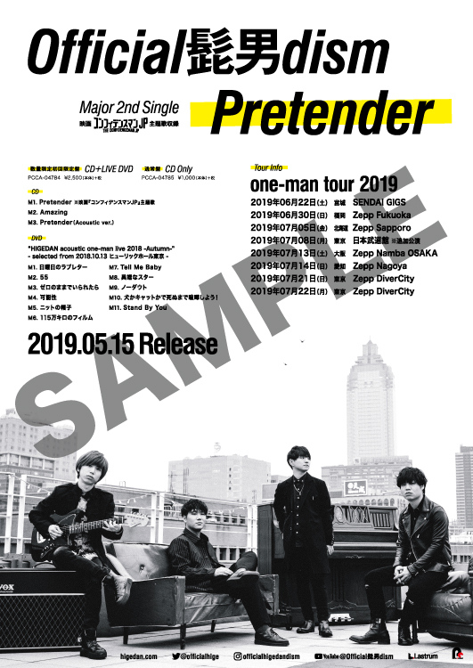 Official髭男dismは、5月17日(金)公開の映画『コンフィデンスマンJP』の主題歌の2nd Single「Pretender」を5月15日(水)にリリースする。