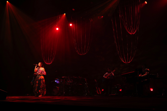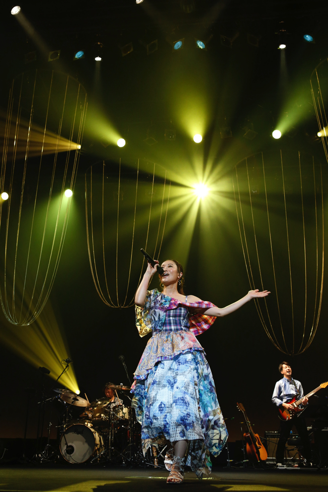 アルバム『Wakana』の1曲目を飾っていた「約束の夜明け」でライブは幕を開けた。メロディに託された言葉たちが繊細に歌として紡がれて会場を包み込んでいく。息を飲み、静かに耳を傾け、その歌声に心を重ねていく観客たち。ライブ開始早々、音楽を介した濃密な時間が展開されていく。