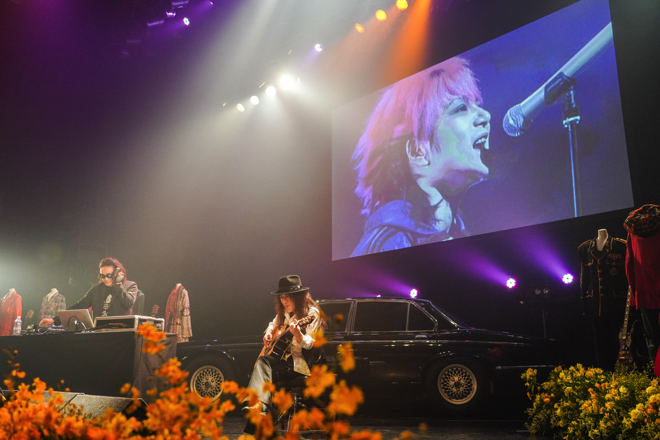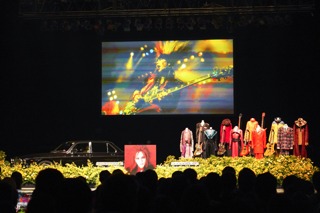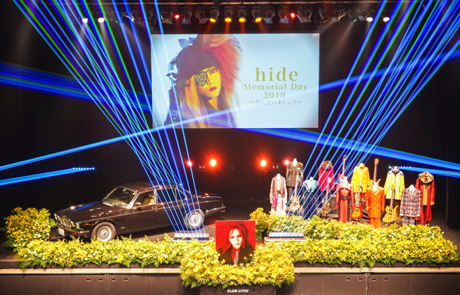会場内のステージ中央に飾られたのは、hideの愛車『(ジャガー)ダイムラー ダブル シックス』。この車はhide自らが注文し、職人の手作業によって作られたもの。通常この車種のカラーはグリーンとされているが、hideのこだわりからブラックカラーに塗装された特注品で、その後、生産が中止になったことから歴史的にも貴重な1台だ。それを囲むようにhideが実際に着用してきた数々の衣装や、愛器のギター・コレクションが特別展示され、春を思わせる華やかな花に囲まれた祭壇と献花台が設けられた。ステージ上に設置された大型スクリーンには約100枚にも及ぶhideの写真やヒストリー映像がスライドショーとして上映され、来場者はスクリーンの映像に映る衣装やギターたちを目の前にしながら祭壇に花を手向けていった。
