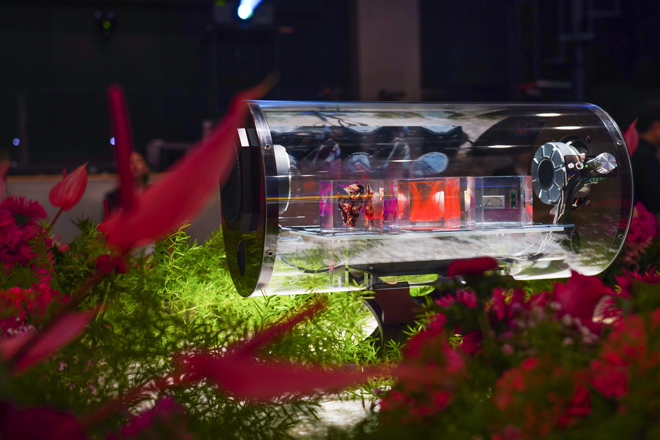 献花会場の中央では、音にこだわり続けたhideの想いを形にすべく、1年間の開発期間を経て遂に完成した『VDSR(注1)スピーカー』が初お披露目。ここから発信するサウンドをBGMに献花式が行われた。表面がスケルトンの筒型スピーカー内には、hideが実際に愛用していた「衣装」や「パソコン」など遺品の一部を収めたキューブ型のオブジェが設置されており、多くのファンが食い入るように見つめていた。