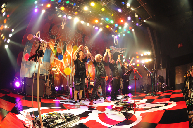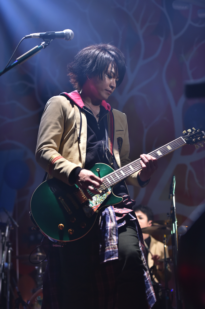 そんなミネムラ”Miney”アキノリ(Vo&G)の言葉に続いて跳びだしたのが、アルバムには未収録、今日のライブでのみ披露された花少年バディーズの「Blue Bad Boy」。ギターの音が鳴り出したとたんにフロア中から黄色い歓声が沸き、会場中の人たちが騒ぎだした。花少年バディーズナンバーは、まだまだ続く。心へ優しい歌声を注ぐよう、ツブク”Mashoe”マサトシ(Vo&B)が「ボールペン」を歌唱。彼の人柄が伝わるメロウでハートフルな歌声と楽曲が、火照った身体を歌の両手で優しく抱きしめてくれるようだ。