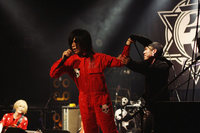 キーンコーンカーンコーン!と放課後を告げるチャイムの音がまず最初に会場内にて鳴り響くと、幕を開けた舞台上にいたのはそれぞれに掃除道具を手にしたアクメのメンバーと教師役の俳優・サトウヒカル氏で、ここで始まったのは学園ドラマ風の寸劇。昨年の1周年記念公演でも上演されたというこの物語の中では、その素行の悪さから留年をしてしまった不良少年たちが今回のライブタイトル通り、今年もまた[PKPKの1年生]として軽音楽部に所属している様子を描くもので、ここから始まるライブは部活紹介にあたるということが観衆へとインフォメーションされることに。
