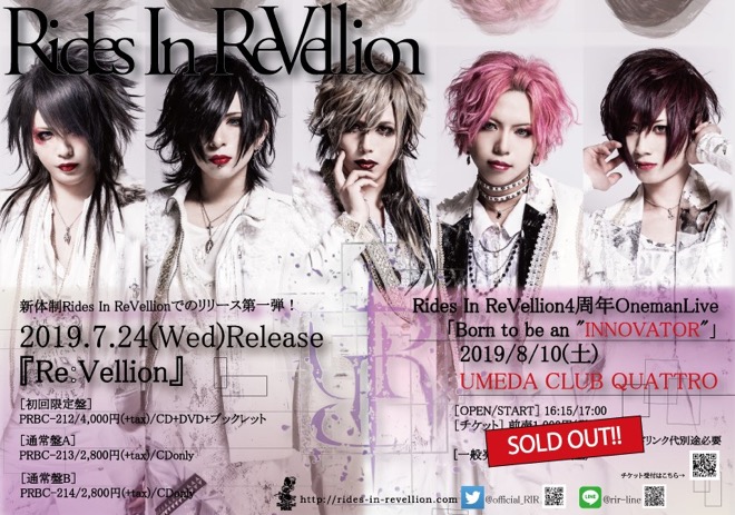Rides In ReVellionが8月10日、梅田CLUB QUATTROにて<4周年 OnemanLive「Born to be an “INNOVATOR”」>を開催する。同公演のチケットが一般発売開始からわずか1時間で完売。急遽、機材エリアや関係者エリアを一部解放して追加チケットを販売することが発表となった。