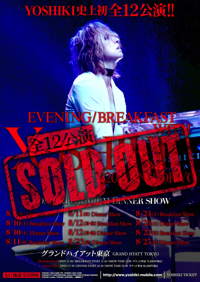 受付は一旦終了したが、ファンからの要望に応えステージおよび座席の調整を行い、ごく僅かではあるが<BREAKFAST WITH YOSHIKI IN TOKYO>のみ2次受付を本日5月14日から先着順にて行うことが決定した。