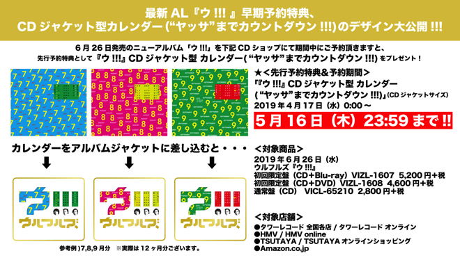 なお、タワーレコード、HMV、TSUTAYA、Amazon.co.jpでは5月16日(木)23:59まで、先行予約特典「『ウ!!!』 CDジャケット型 カレンダー (“ヤッサ”までカウントダウン!!!)」がもらえる先行予約特典キャンペーンも実施中だ。