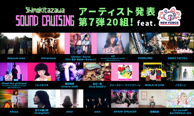 今回出演が明らかになったのは、Absolute area、Attractions、Candye♡Syrup(IKU るか ゆめみーちゃんっ!)、DJ younaP! & ようなぴ solo set.、eill、EVERLONG、Ghost like girlfriend、MONJU N CHIE、sikisi、soha、SPARK SPEAKER、ノクターン、ハレトキドキ、ふゆのどうぶつえん、メリーメリー♡ファンファーレ、れみふぁ、影正一貴(Club BAGSY)、佐々木健太郎(Analogfish)、須澤紀信、飯田瑞規(cinema staff)の20組だ。