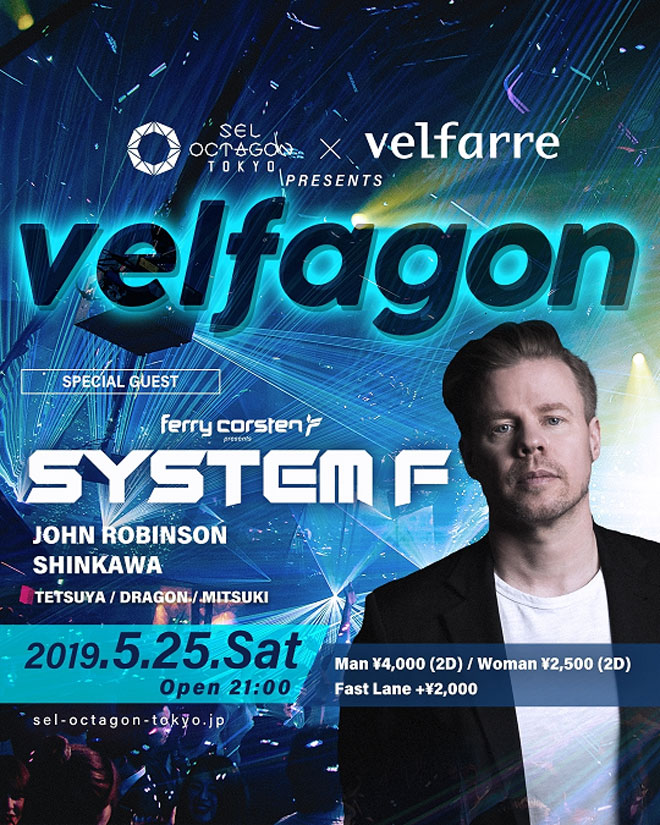 当日はSPECIAL GUEST DJ 「SYSTEM F」、velfarreレジデントDJ「JOHN ROBINSON」「DJ SHINKAWA」「TETSUYA」「DRAGON」「MITSUKI」による豪華共演で、ヴェルファーレが完全再現される。