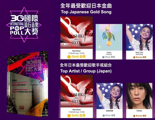 また人気アニメ「進撃の巨人」のテーマソングとなったYOSHIKI feat. HYDEの楽曲「Red Swan」が、「トップ・ジャパニーズ・ゴールド・ソング賞」部門で1位に輝いた。(全受賞者のリストはこちら: https://app4.rthk.hk/special/poppoll30/)