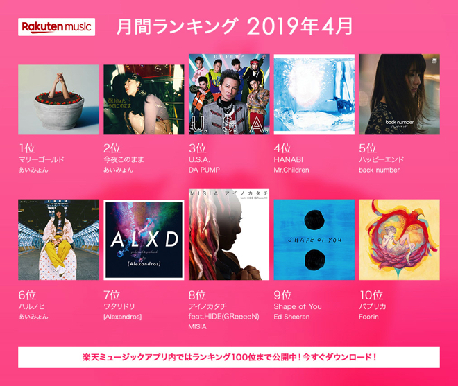 楽天の定額制音楽聴き放題サービス「Rakuten Music」の2019年4月の月間再生ランキングが発表された。