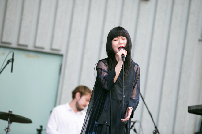 「次にテレビでCMを観たときは、あ、SACHIKOだ、MAISON“SEEK”だと思ってください(笑)。自己紹介もできたので、引き続きMAISON“SEEK”の音に酔いしれて、1日楽しんでいってください」と、後半へと突入。アンビエントなパートからクールで躍動的なサウンドへと展開していく「終わらない季節」、そして低音感のあるエレクトロ・サウンドの「微睡」で聴かせる、スモーキーなファルセットボイスやハイトーンは美しく叙情的だ。特に切ない心をハイトーンで紡ぐ「微睡」は、ぐっと胸に迫る。密室的な曲でもあるが、こうした野外でもまた映える曲だ。また「君空域」では、SACHIKOがサビで大きく手を振ると、観客もまた手を振り、そして大きな手拍子を送って曲にエネルギーを送る。アップリフティングなボーカルは、会場を超え、上昇していくような感覚だ。