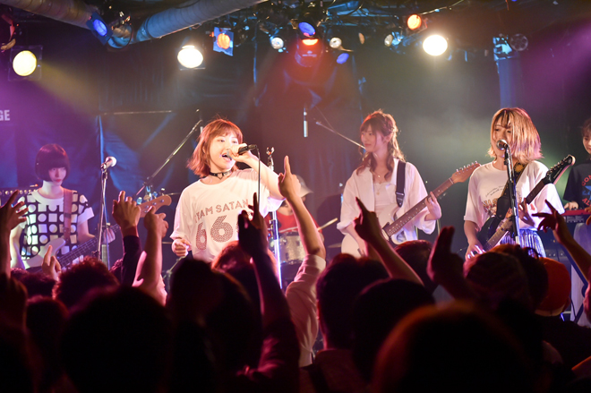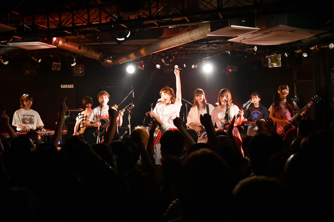 そして、この日の最後に登場したのは、ベースのЯuuとドラムの成澤愛実を中心にした、39人のメンバーの中でも突出した演奏技術を持つテクニカルなバンド。宇都宮未来と山本朱莉によるツインボーカル編成のバンドは観客からの拍手の歓迎を受けて登壇し、エネルギッシュにラウドにプレイ。この日の中では最もロックバンド然としたステージングを見せ、フロアには「オイ!オイ!」という掛け声が湧き上がった。山本は「この日まで毎日毎日、練習を重ねてきました。初ライブのステージを皆さんと作り上げることができてすごく嬉しいです。人生で一度しかないデビューライブが最高のステージになりました」と語り、最後に彼女たちが担当する青春パンク「歌いたくて歌いたくて」(全形態収録)を歌うと、場内は大合唱となった。