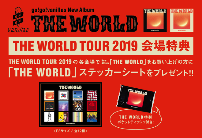 <THE WORLD TOUR 2019>各会場にてNew Album『THE WORLD』(完全限定生産盤 / 通常盤2形態のうちいずれか)をご購入の方に、“THE WORLDステッカーシート (THE WORLD 特製ポケットティッシュ付き)”をプレゼント