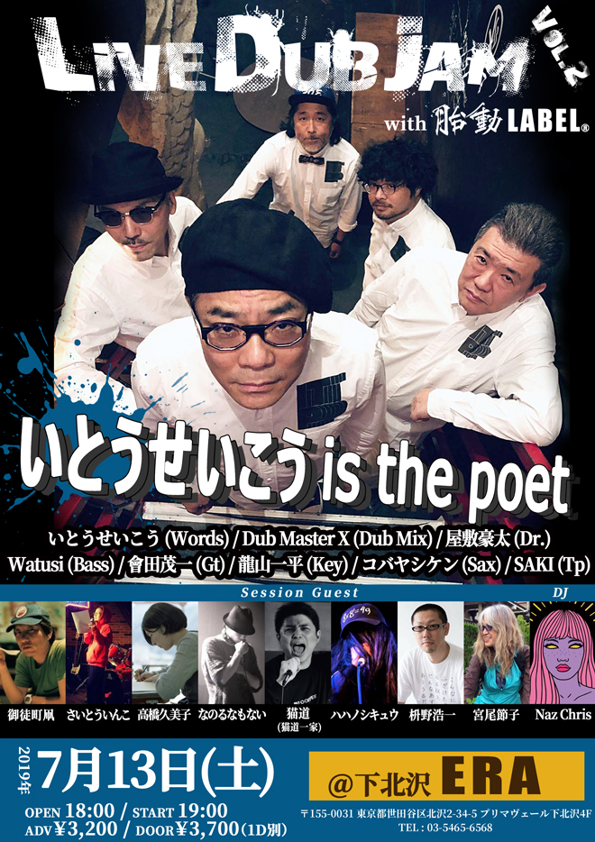 来る7月13日、 下北沢ERAにて、いとうせいこう率いるタブポエトリーユニット「いとうせいこう is the poet」と胎動LABELブッキングの豪華ゲスト詩人によるセッションイベント<Live Dub Jam vol.2>の開催が決定した。