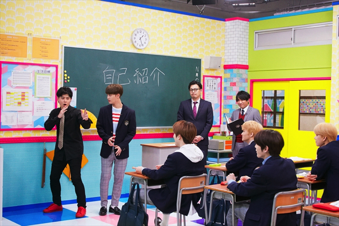 さらに6月9日0時より配信される第1話のあらすじと場面カットも公開された。第1回目の授業テーマは「自己紹介」で、特別講師としてオジンオズボーン・篠宮暁が登場。1,000以上ものギャグレパートリーを持つ篠宮暁がメンバーそれぞれの自己紹介を考案し、実際に彼らが習得すると言う授業内容になっている。名前を使ったダジャレや日本人にお馴染みのギャグやアニメを取り入れた自己紹介に、メンバーたちはたじたじ。しかし成績の悪かったメンバーには居残り授業が待っているとあり、必死に習得しようとする。また、番組内では“放課後トーク”と題した、収録の反省や感想をゆるく語るメンバーたちのオフな姿も垣間見えるコーナーも用意されている。