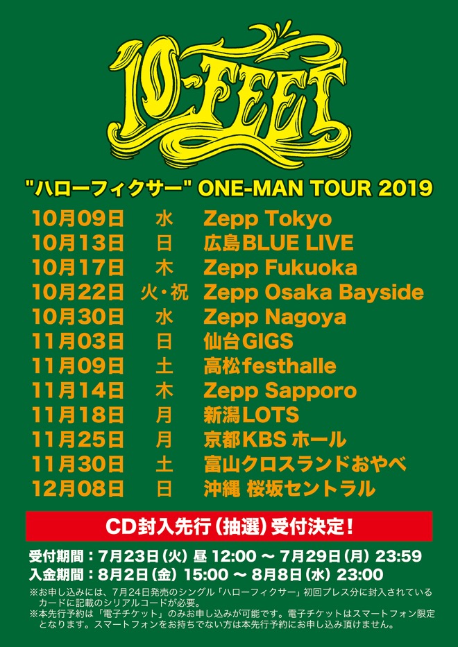 ワンマンツアー<10-FEET“ハローフィクサー”ONE-MAN TOUR 2019>のチケット先行は、“超最速”として“オフィシャル0次先行抽選受付”が10-FEET MOBILE会員限定にて昨日6月1日に12時間限定で行われたが、10-FEET MOBILE会員ではないファンにとって、このCD封入先行抽選受付がチケットを最速でゲットできるチャンスだ。受付期間は、7月23日昼12:00から7月29日23:59まで。封入されるのは初回プレス分のみとなる。