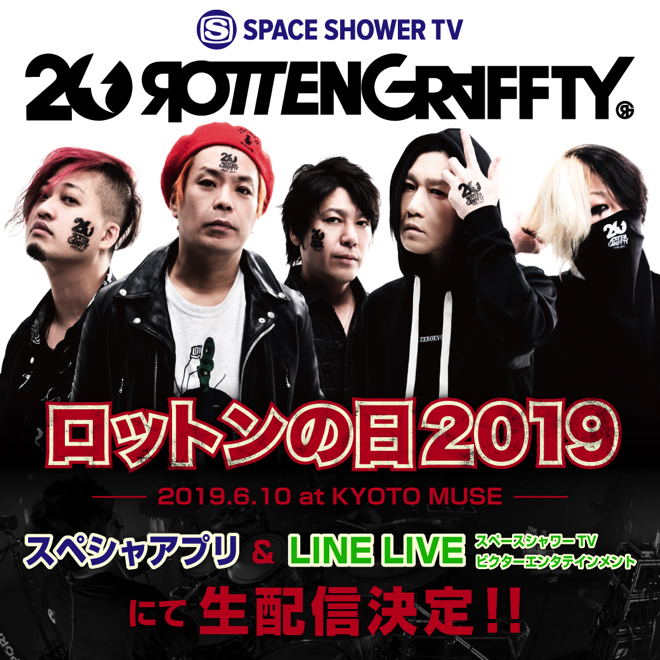 2019年1月1日より活動20周年のアニバーサリーイヤーに突入した彼らは、現在全国ツアー<20th Anniversary Beginning of the Story>を敢行中。恒例の6月10日“ロットンの日”には、dustboxをゲストに迎えた京都公演が開催される。今回の番組ではソールドアウトとなった同公演より、ROTTENGRAFFTYのライブの模様がビクターエンタテインメント及びスペースシャワーTVの公式LINE LIVE、スペシャアプリの3チャンネルで同時生配信されるという。